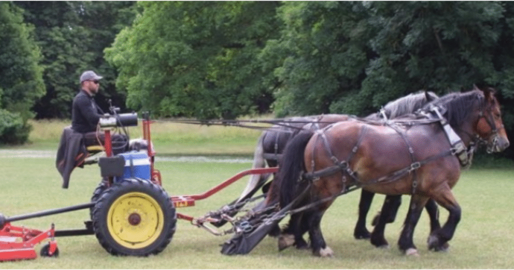 Au parc du château, la tondeuse à gazon est un cheval